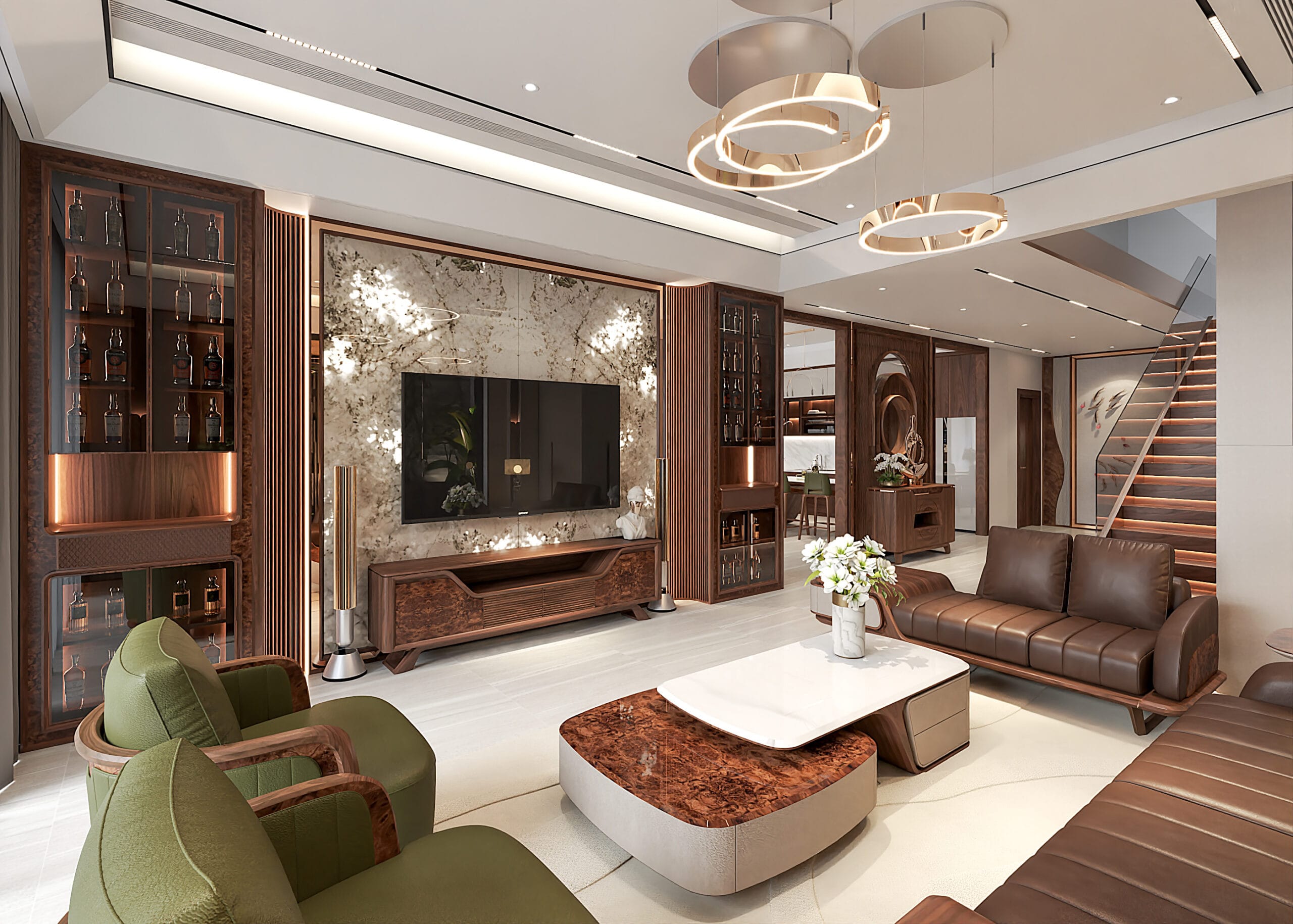 Phòng khách được thiết kế theo tiêu chuẩn cao cấp, lấy gỗ óc chó làm vật liệu chủ đạo cho sofa, vách trang trí và kệ tivi. Tông nâu trầm đặc trưng của gỗ kết hợp ánh sáng tự nhiên giúp không gian trở nên ấm áp, sang trọng và có chiều sâu.