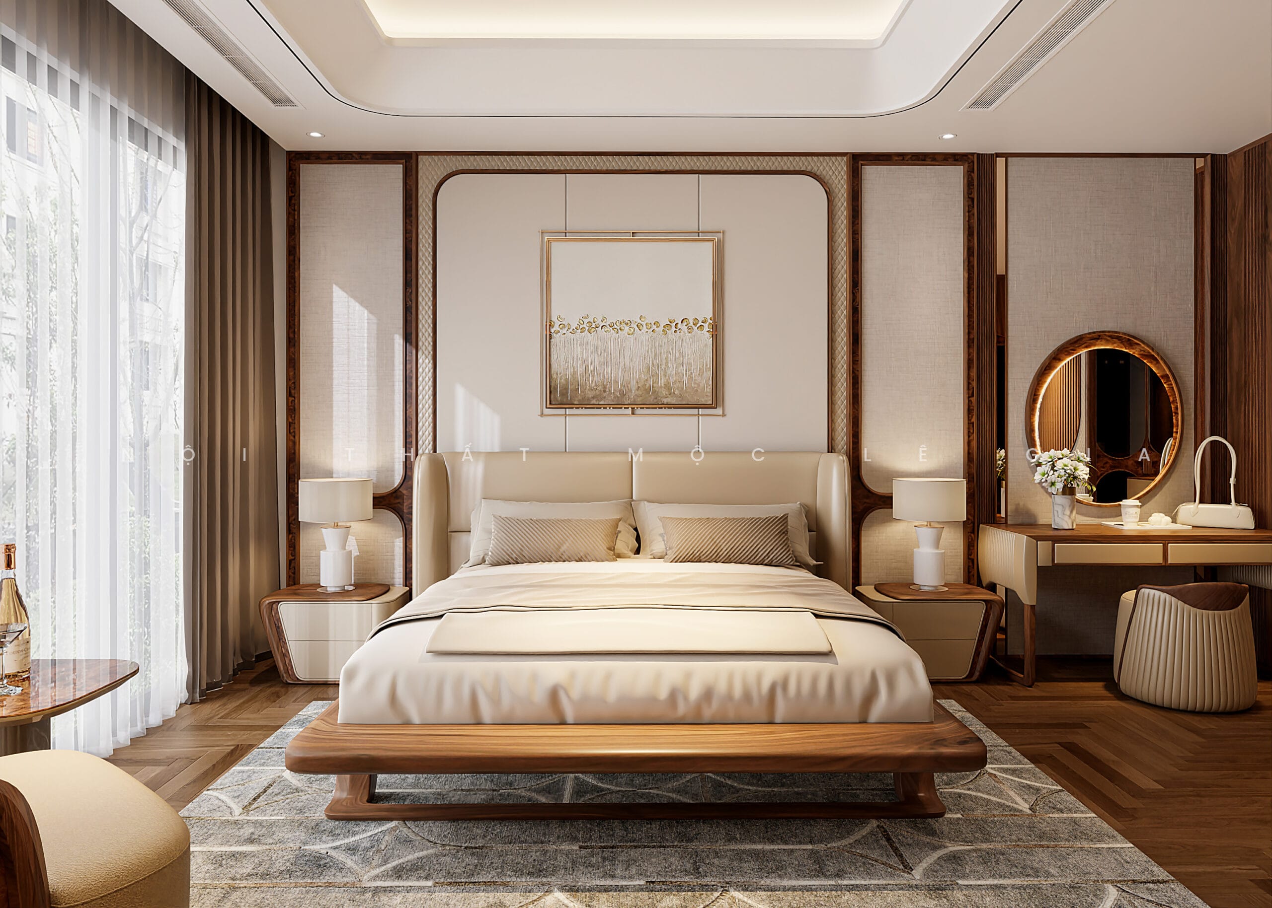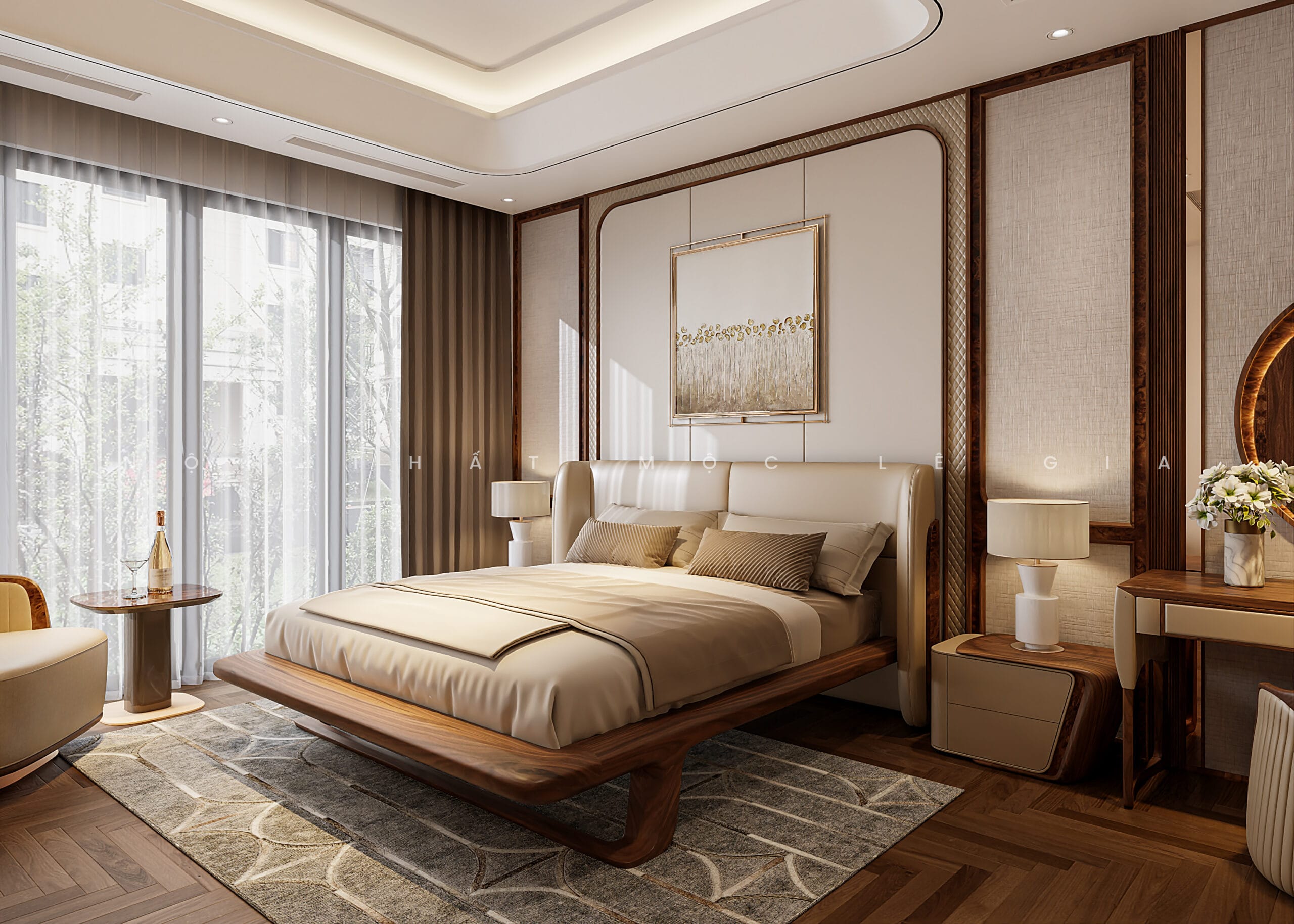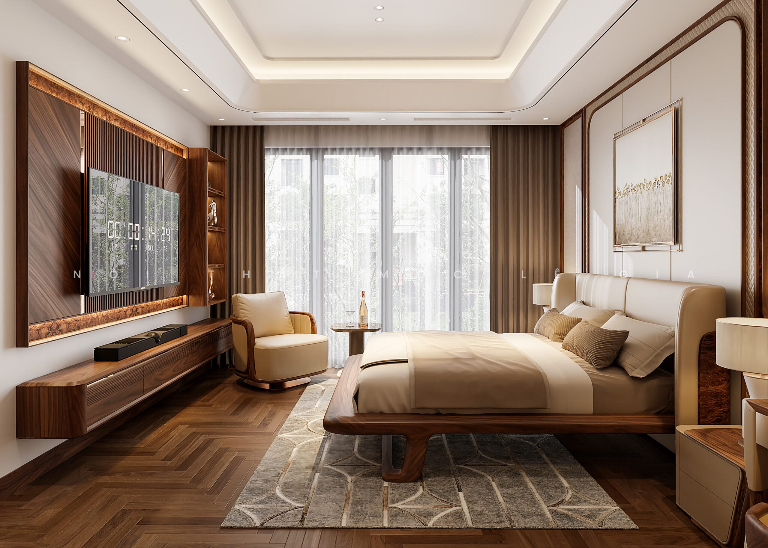 Các phòng ngủ được thiết kế theo tiêu chí tối giản nhưng tinh tế, tập trung vào công năng và cảm xúc sử dụng. Gỗ óc chó mang đến cảm giác thư thái, dễ chịu, giúp gia chủ tái tạo năng lượng sau mỗi ngày làm việc.